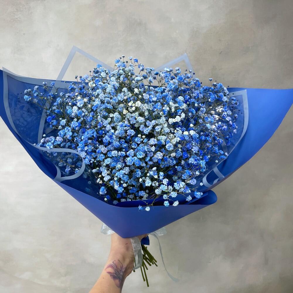 Гипсофила синяя – 7 шт.Упаковка дизайнерская – 2 шт.Лента – 1 шт.