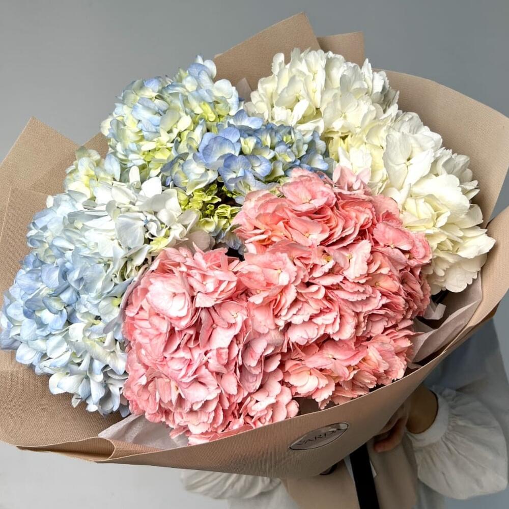 Авторская композиция из гортензий, роз и ранункулюсов в шляпной коробке