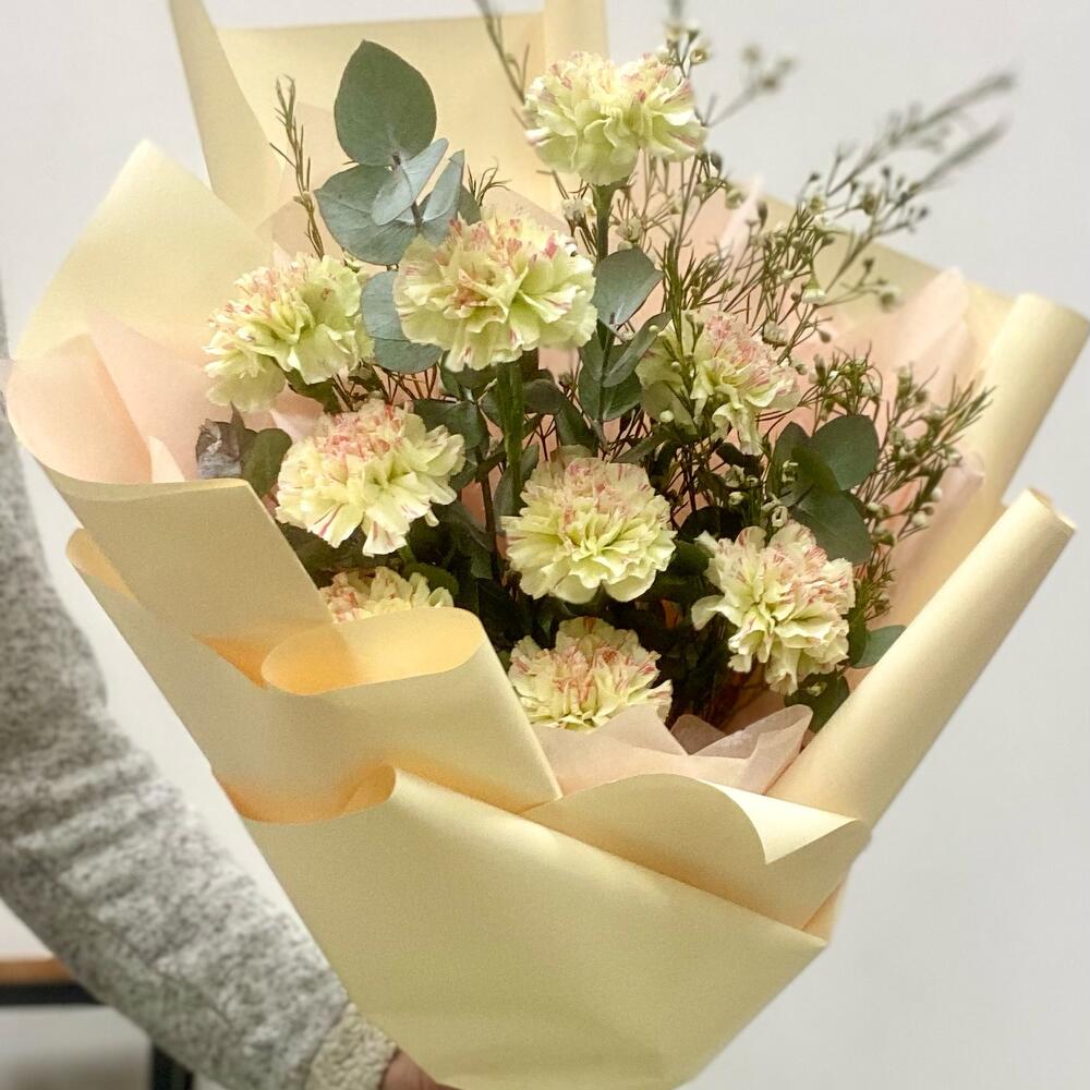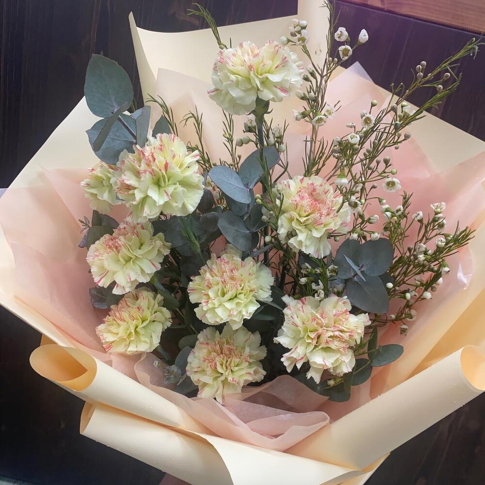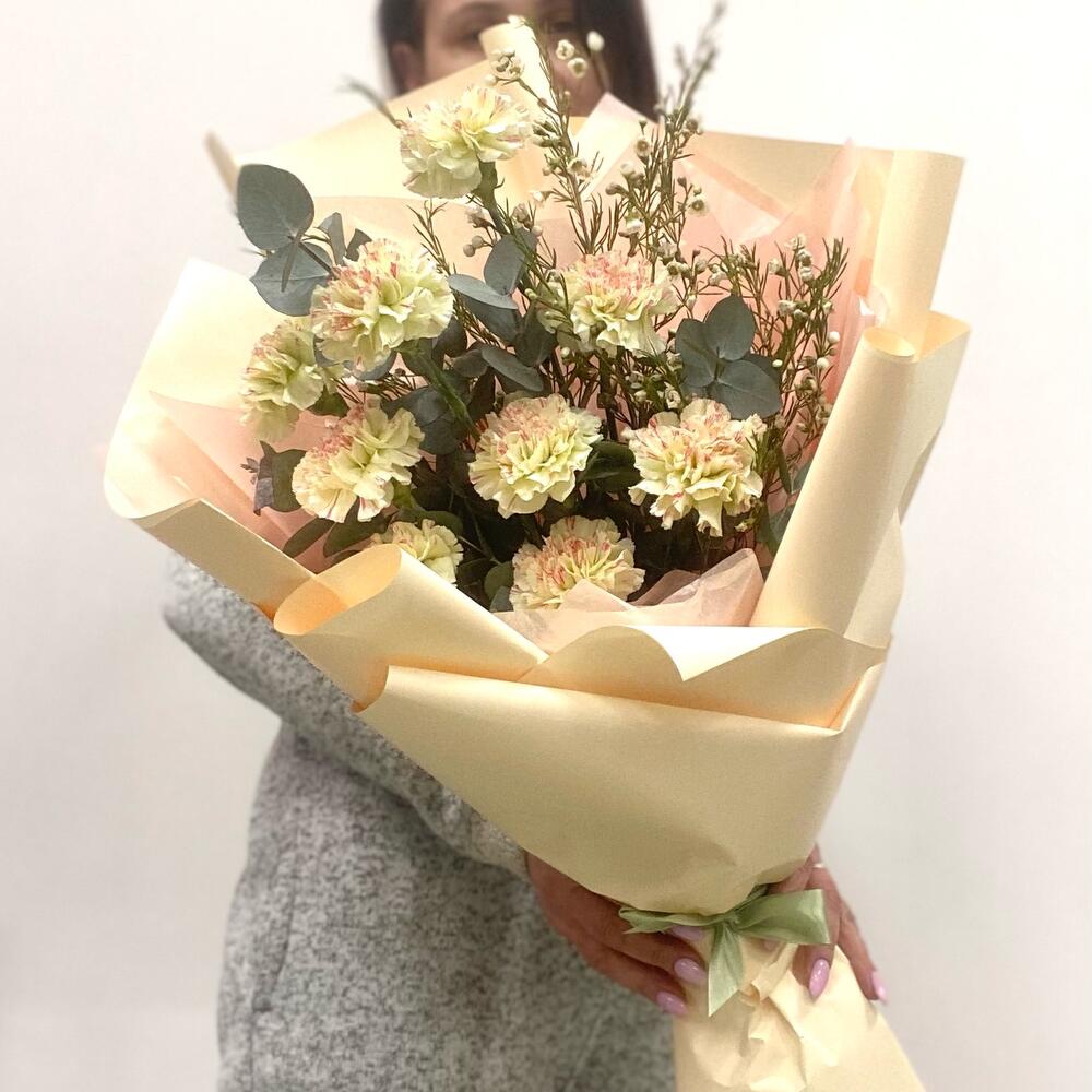 Диантус – 9 шт.Хамелациум – 1 шт.Эвкалипт – 1 шт.Упаковка дизайнерская – 2 шт.Лента – 1 шт.