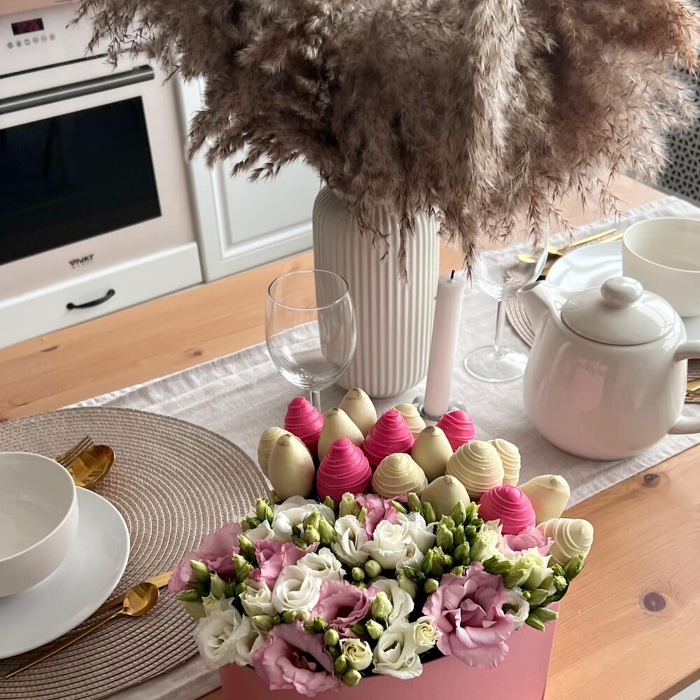 Букет из клубники в шляпной коробке с живыми цветами СИЛЬНАЯ ЛЮБОВЬ