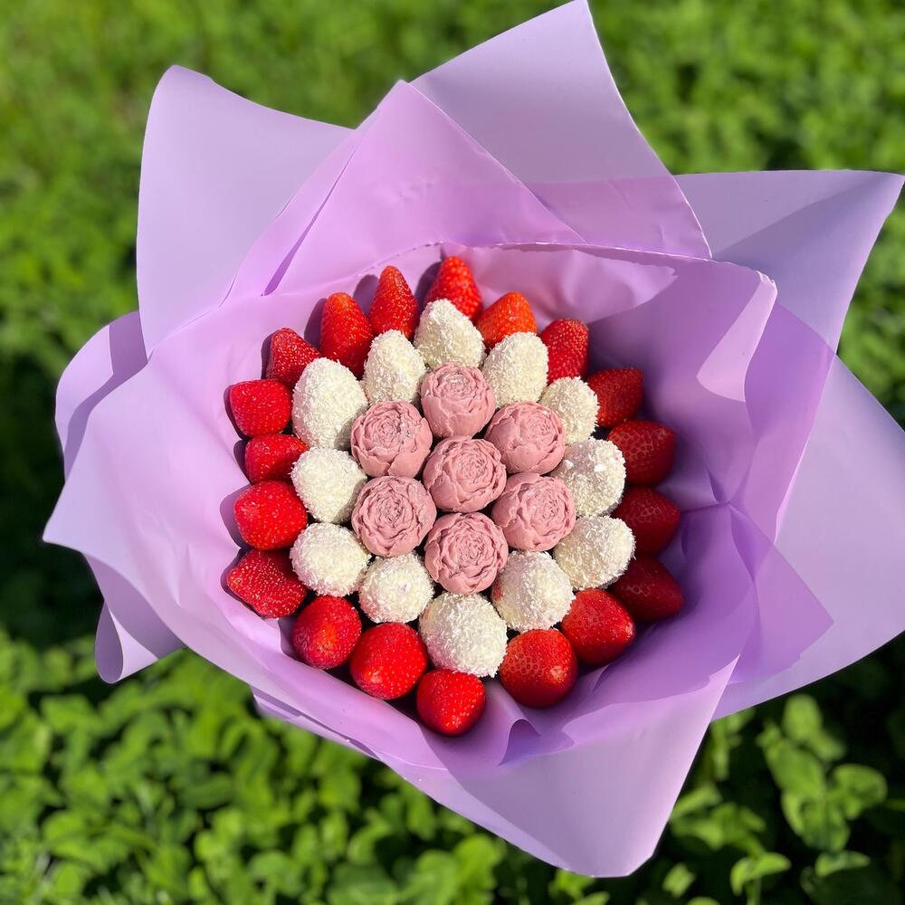 Клубника без шоколада – 18 шт.клубника в белом шоколаде с кокосовой стружкой – 12 шт.пионы шоколадные – 7 шт.