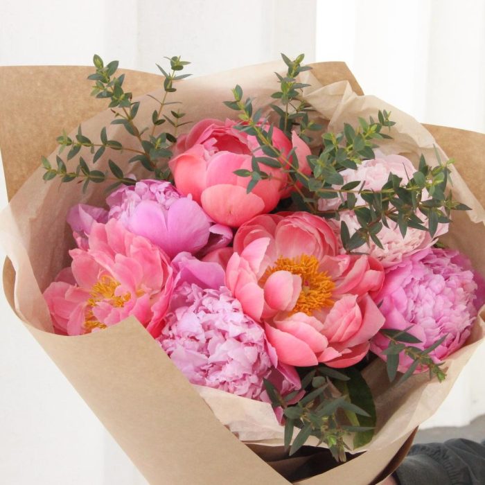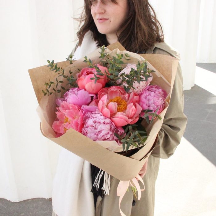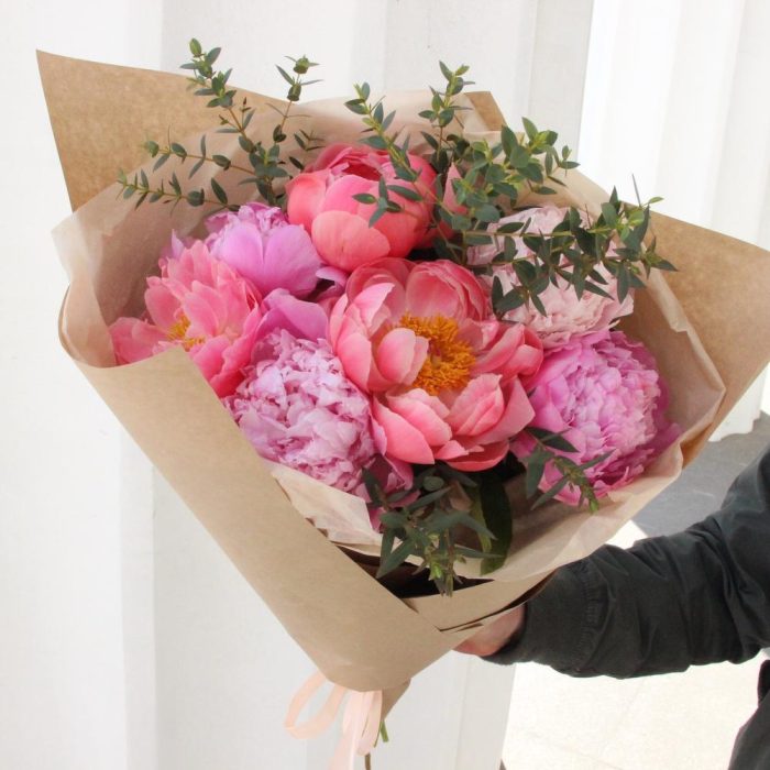 Лента – 1 шт.Пион – 7 шт.Эвкалипт – 3 шт.Тишью – 1 шт.Упаковка крафт – 2 шт.