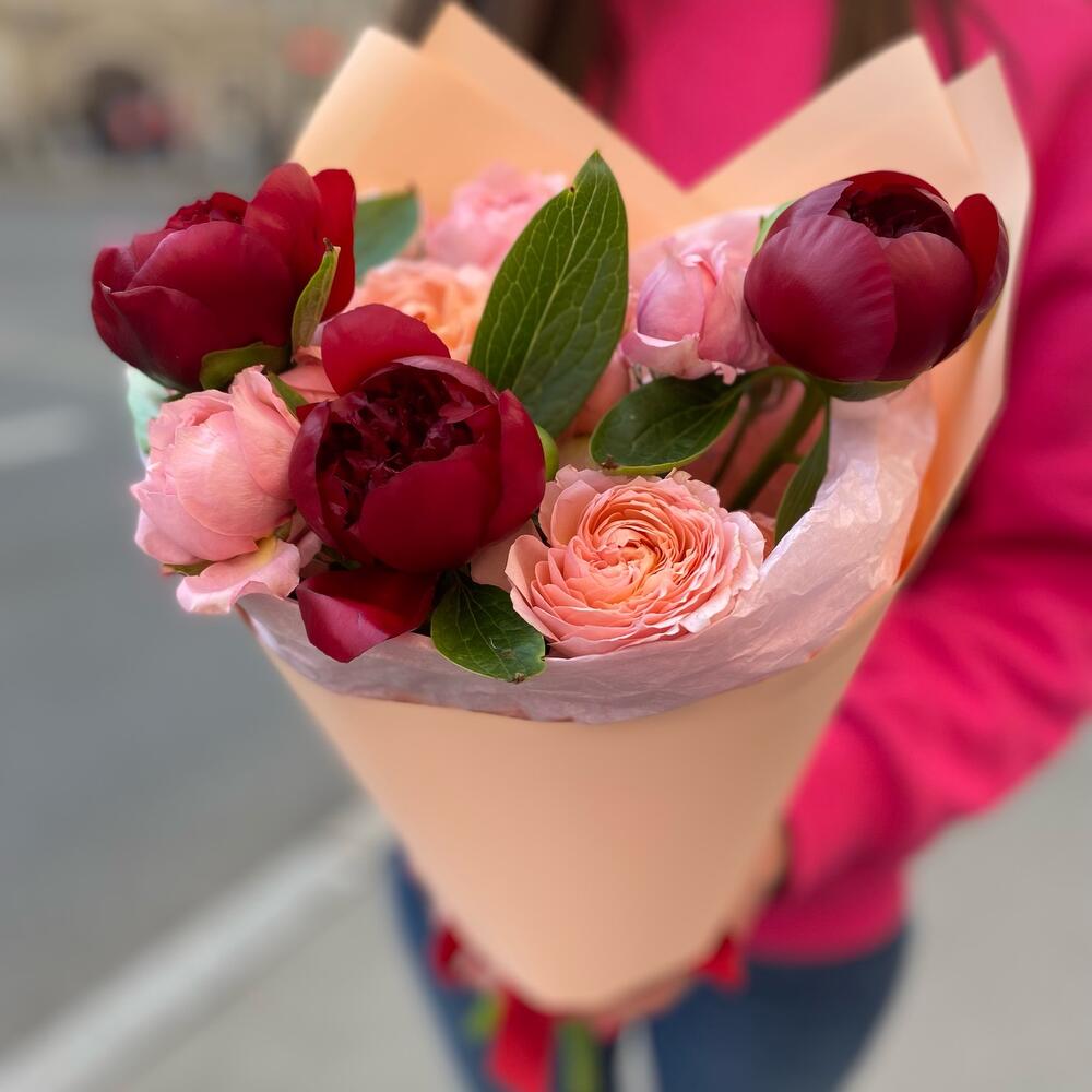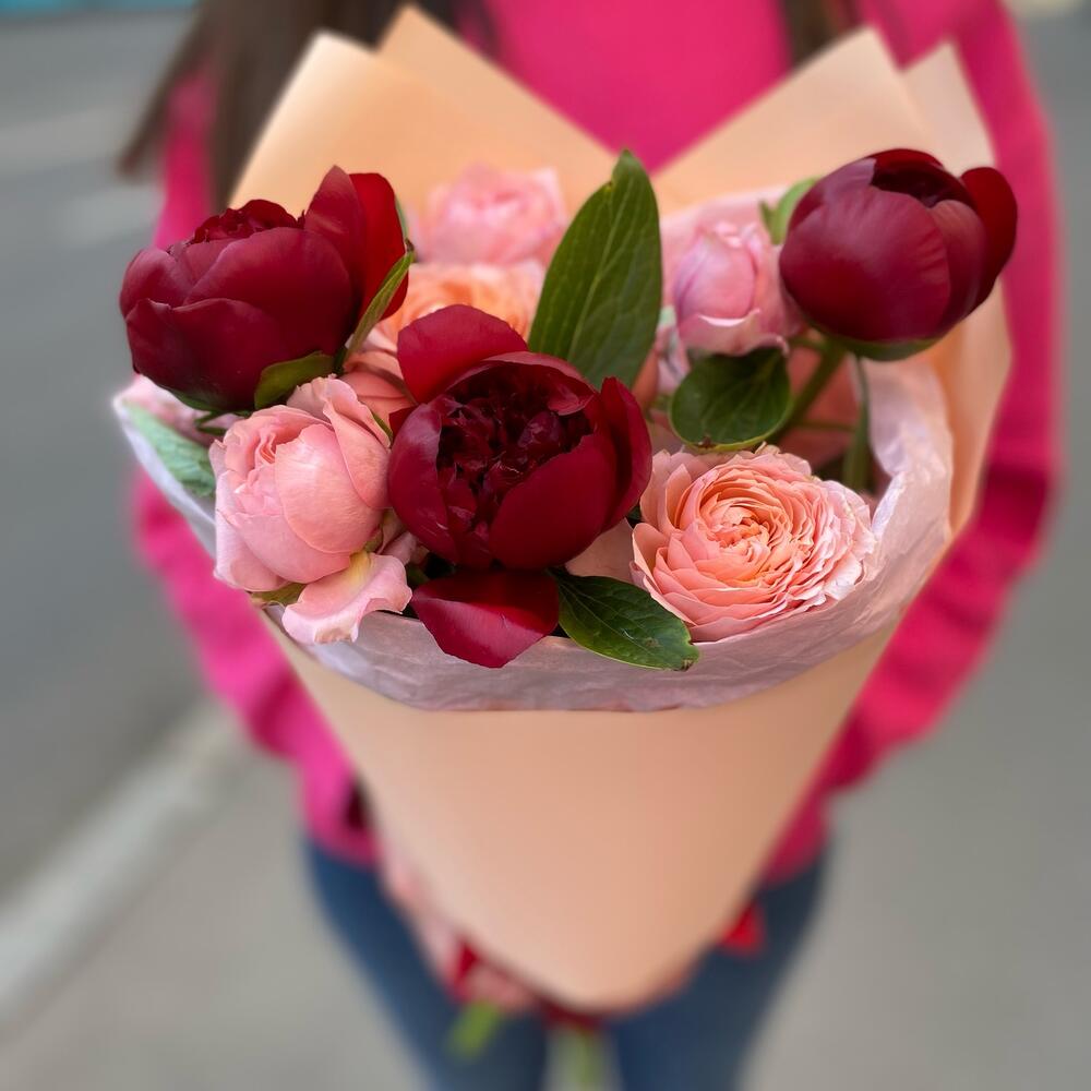 Пион – 3 шт.Роза кустовая пионовидная – 2 шт.Упаковка дизайнерская – 1 шт.