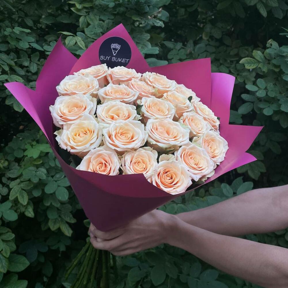 Лента атласная – 1 шт.Упаковка дизайнерская – 2 шт.Кремовая роза – 21 шт.