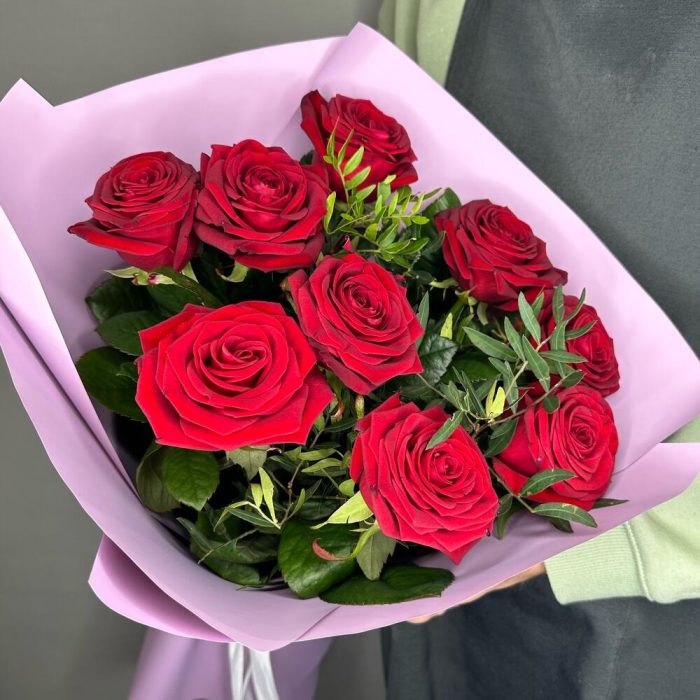 Лента атласная – 1 шт.Фисташка – 2 шт.Упаковка дизайнерская – 1 шт.Роза одноголовая россия – 9 шт.