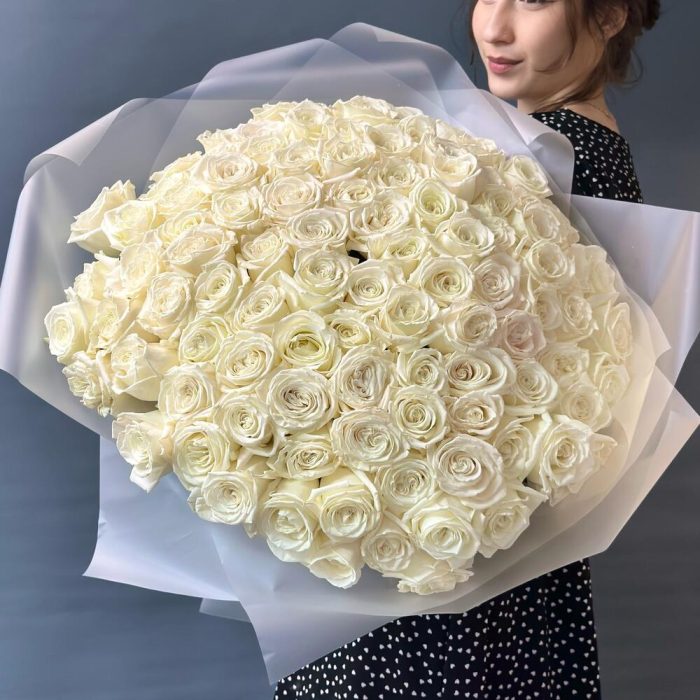 роза пионовидная плая бланка – 99 шт.матовая прозрачная корейская пленка – 4 шт.Лента атласная – 2 шт.