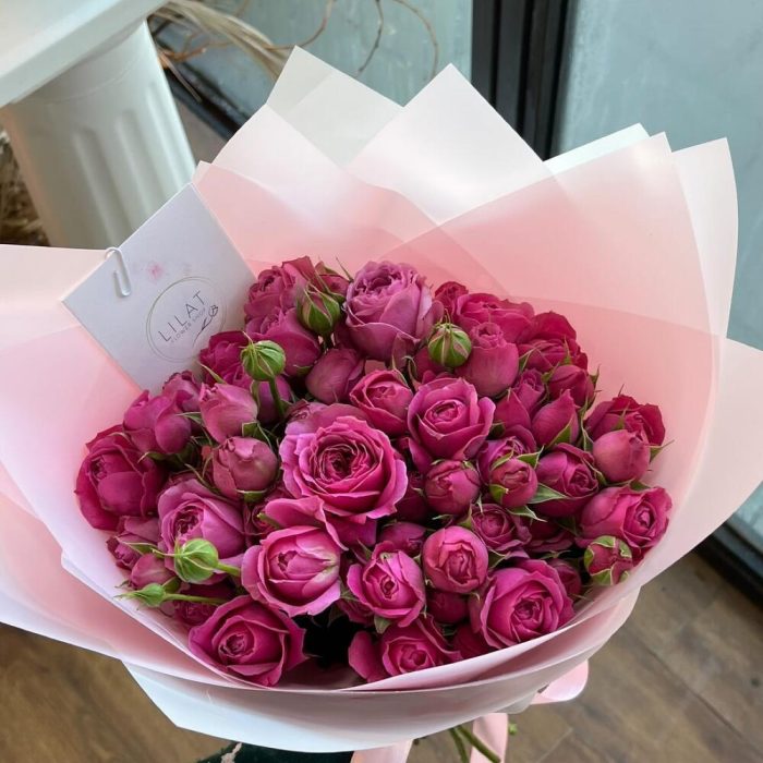 Упаковка дизайнерская – 1 шт. Открыточка с вашими пожеланиями – 1 шт. инструкция по уходу за цветами – 1 шт. Misty Bubbles пионовидная роза – 9 шт.