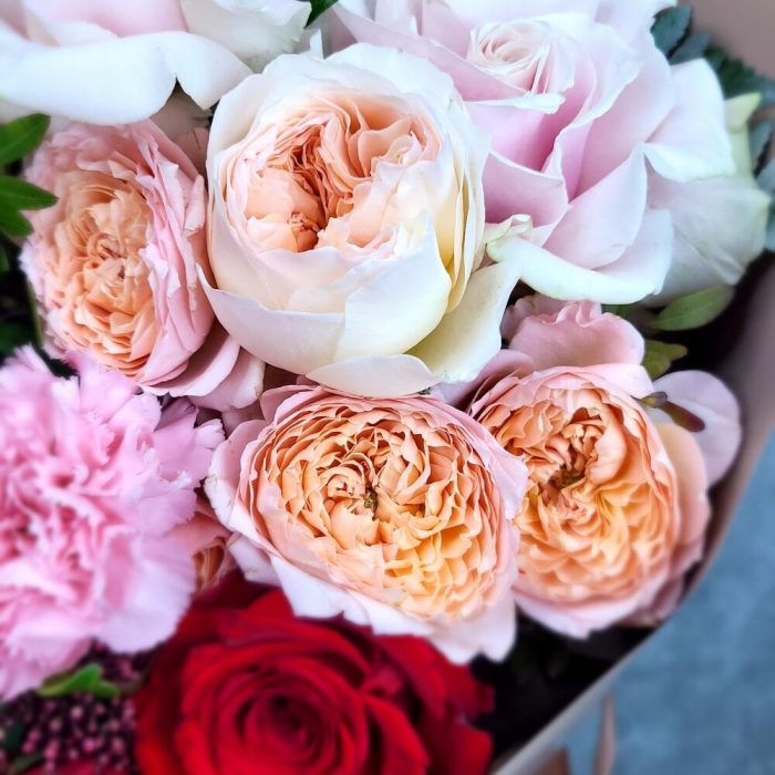 Роза Эквадор – 2 шт.Роза Россия – 3 шт.Роза пионовидная – 1 шт.Скиммия – 1 шт.Упаковка дизайнерская – 1 шт.Роза Джульетта – 1 шт.