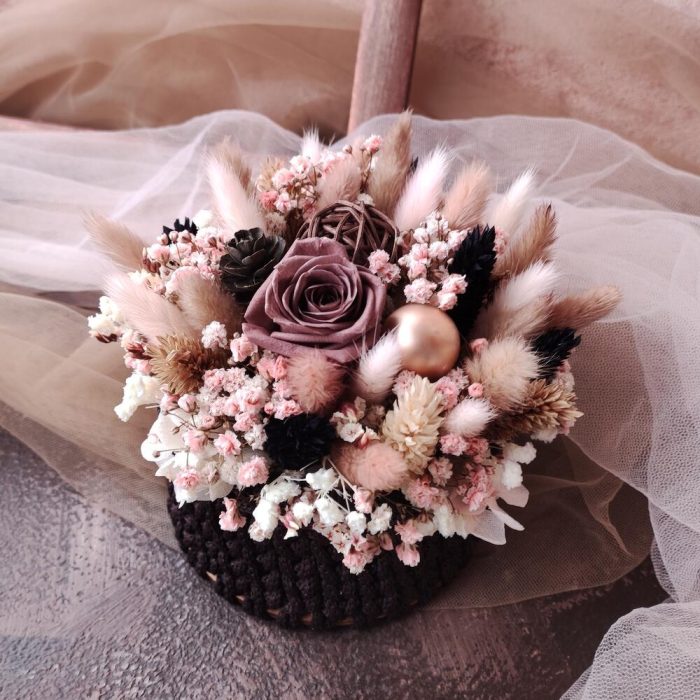 Гипсофила – 5 шт.Лимониум – 1 шт.Роза стабилизированная – 1 шт.Лагурус – 20 шт.фаларис сухоцвет – 15 шт.корзина вязаная ручной работы – 1 шт.