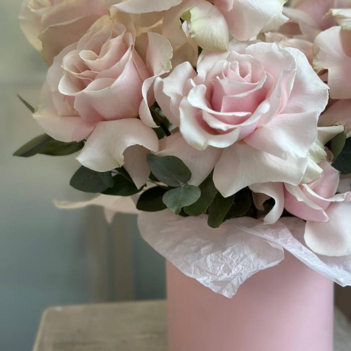 Нежные вывернутые розы в шляпной коробке