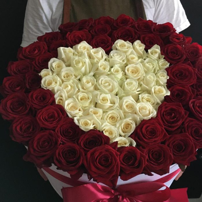 Роза red naomi – 70 шт.Роза Аваланж – 31 шт.Коробка шляпная – 1 шт.Оазис флористический – 5 шт.Лента атласная – 3 шт.